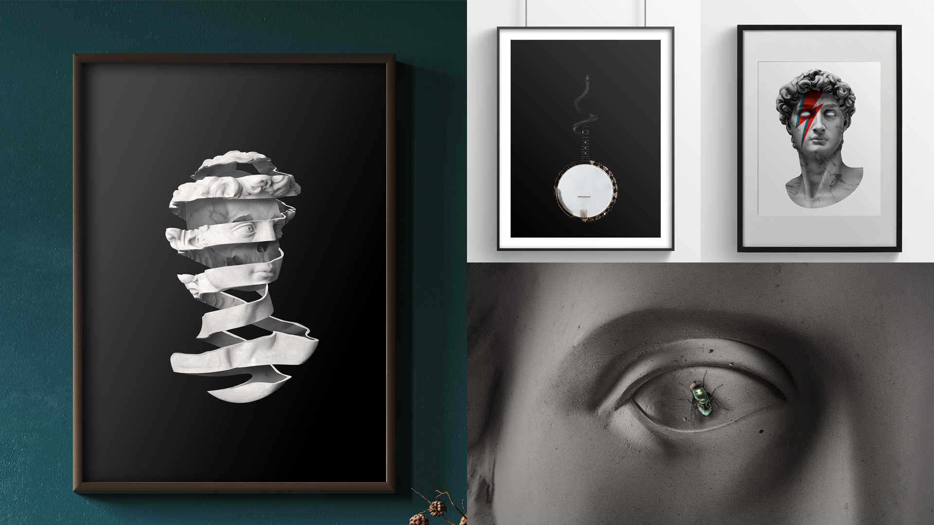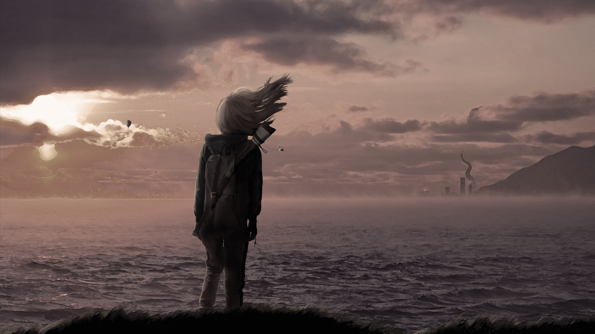 Digital art of a lone figure standing on a cliff, overlooking a misty ocean at sunset. In the distance, a twisted structure looms over a fog-covered city, while a hot air balloon drifts through the dramatic sky.