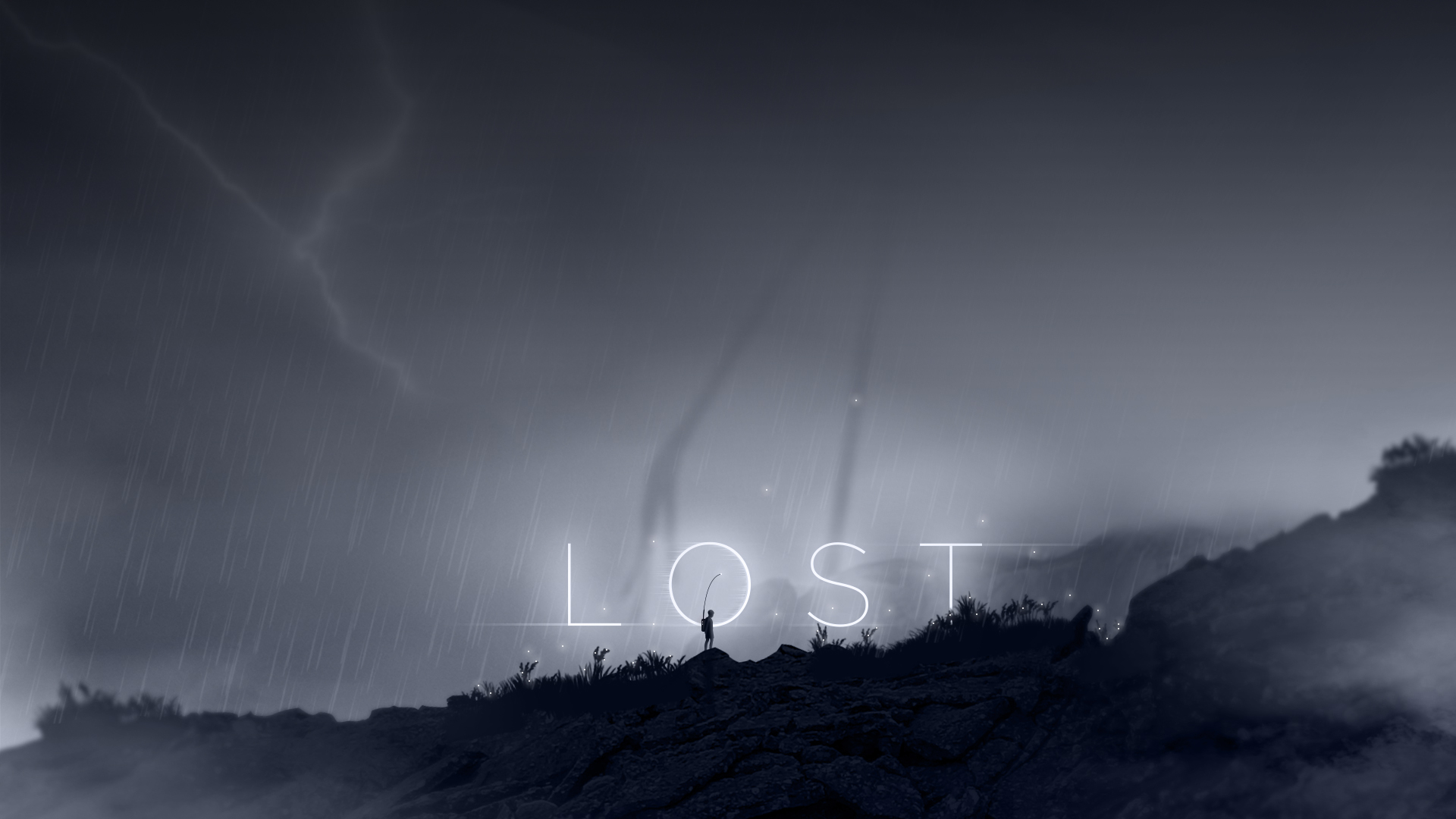 Digital art of a traveler walking through a dark, rainy landscape, illuminated by the word “LOST” in glowing letters. The ominous sky is split by lightning, and mist rises around the traveler.