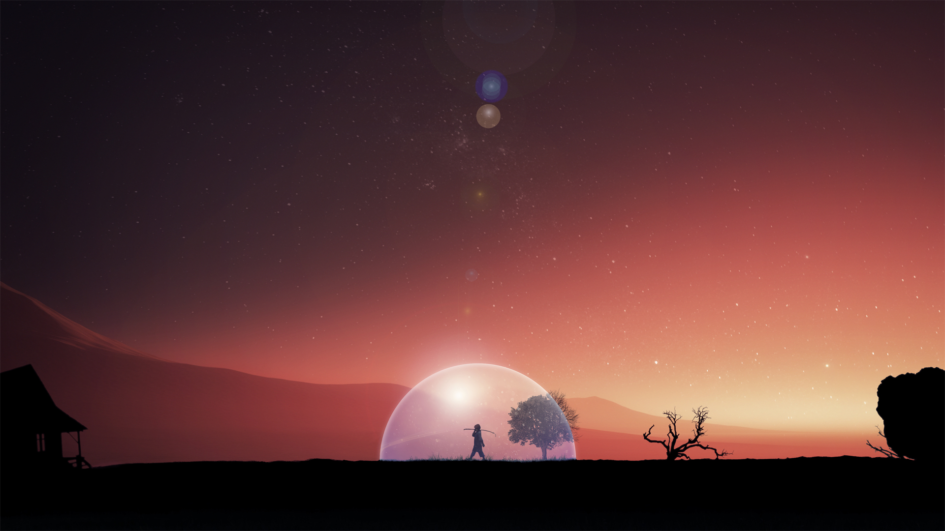 Digital art of a boy walking inside a protective dome under a starry sky, surrounded by a barren landscape at sunset. The scene blends isolation with a sense of wonder, as the fading light contrasts with the vastness of the universe above.